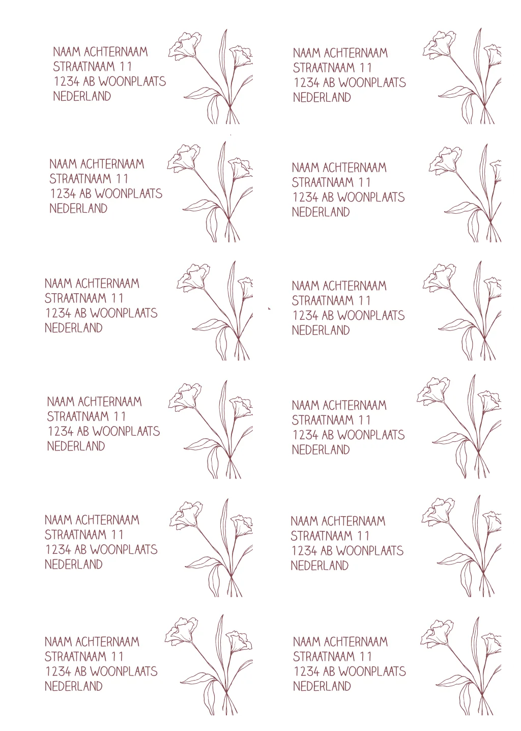 Stijlvolle adresstickers met getekende bloem. Het design kun je helemaal aanpassen en alle adressen plaats je heel eenvoudig zelf in de editor op de adresstickers.