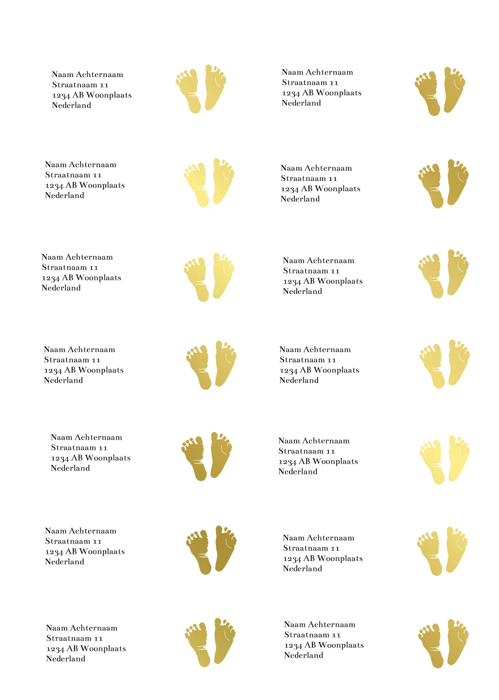 Stijlvolle adresstickers met goud folie voetjes. Het design kun je helemaal aanpassen en alle adressen plaats je heel eenvoudig zelf in de editor op de adresstickers.