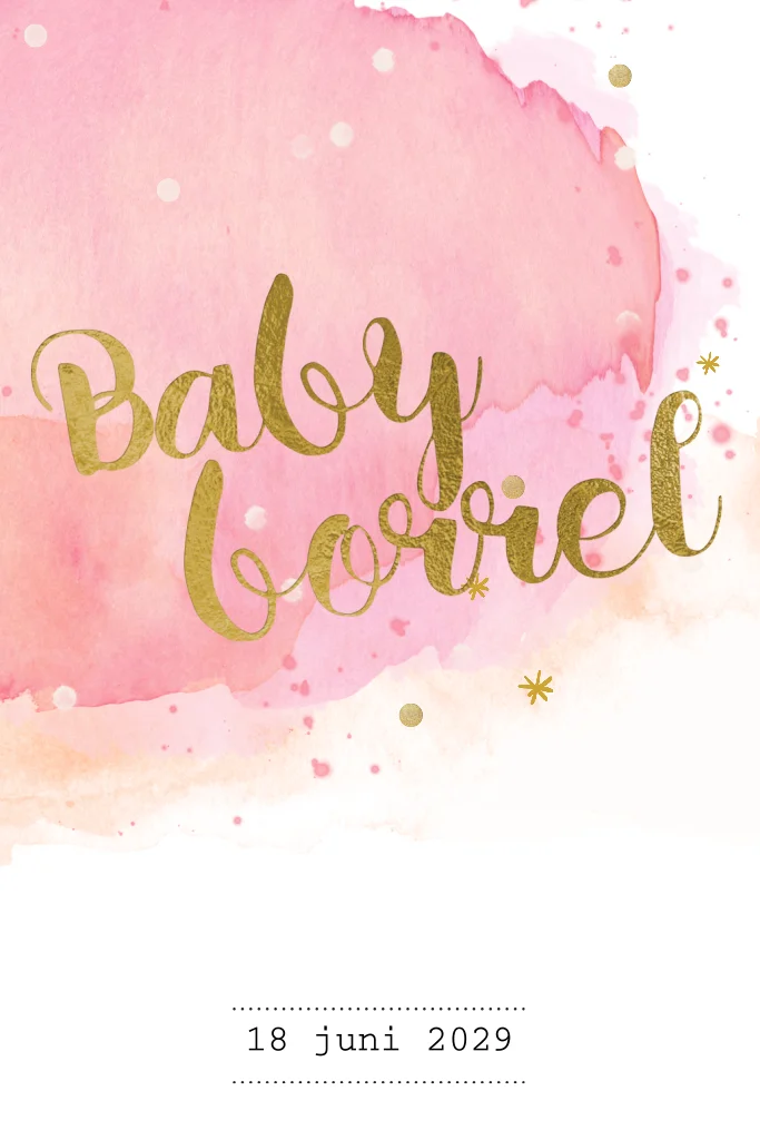 Kraamfeest uitnodiging roze aquarel en hippe goud look letters.