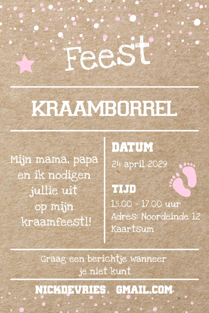 Kraamborrel uitnodiging kraft kleurige achtergrond, roze babyvoetjes en confetti.