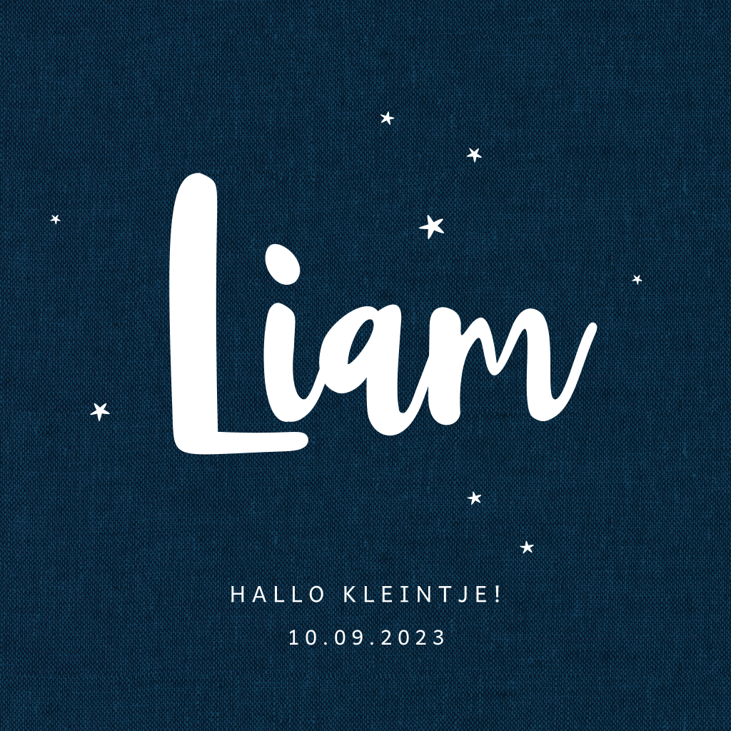 Geboortekaartje jongen denim / jeans structuur donkerblauw met goudfolie naam. De kleur blauw en foliedruk is naar wens aan te passen. (3633)