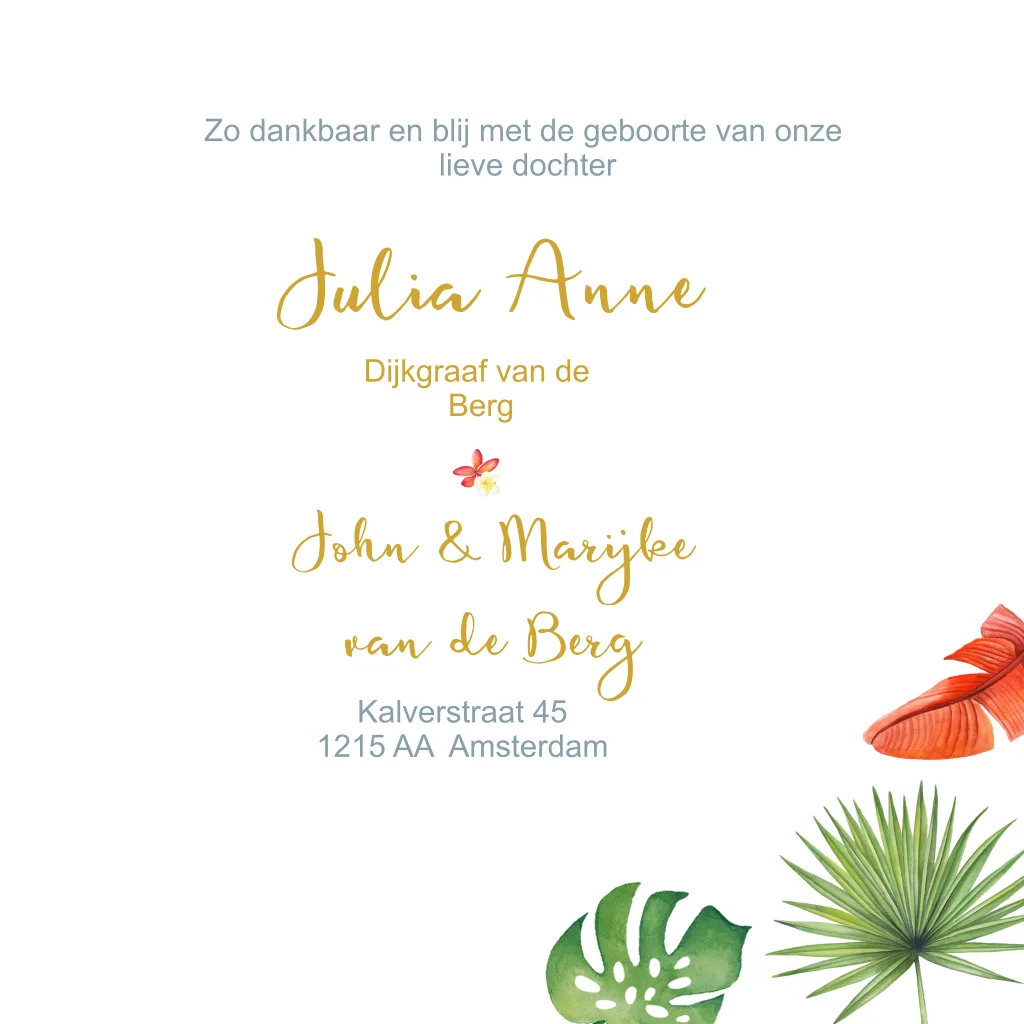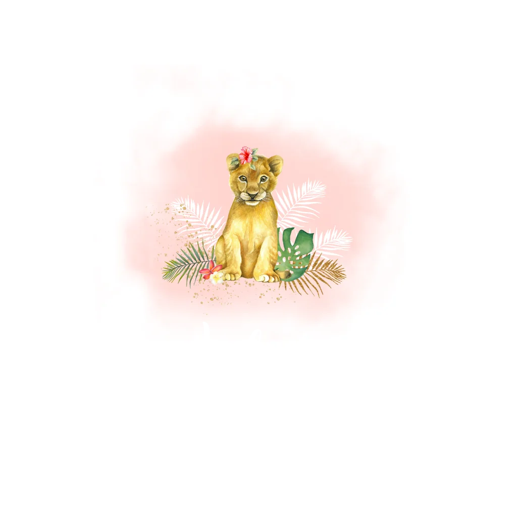 Geboortekaartje met lief klein leeuwtje voor een meisje op tropisch blad en echt goudfolie druk. (3498)