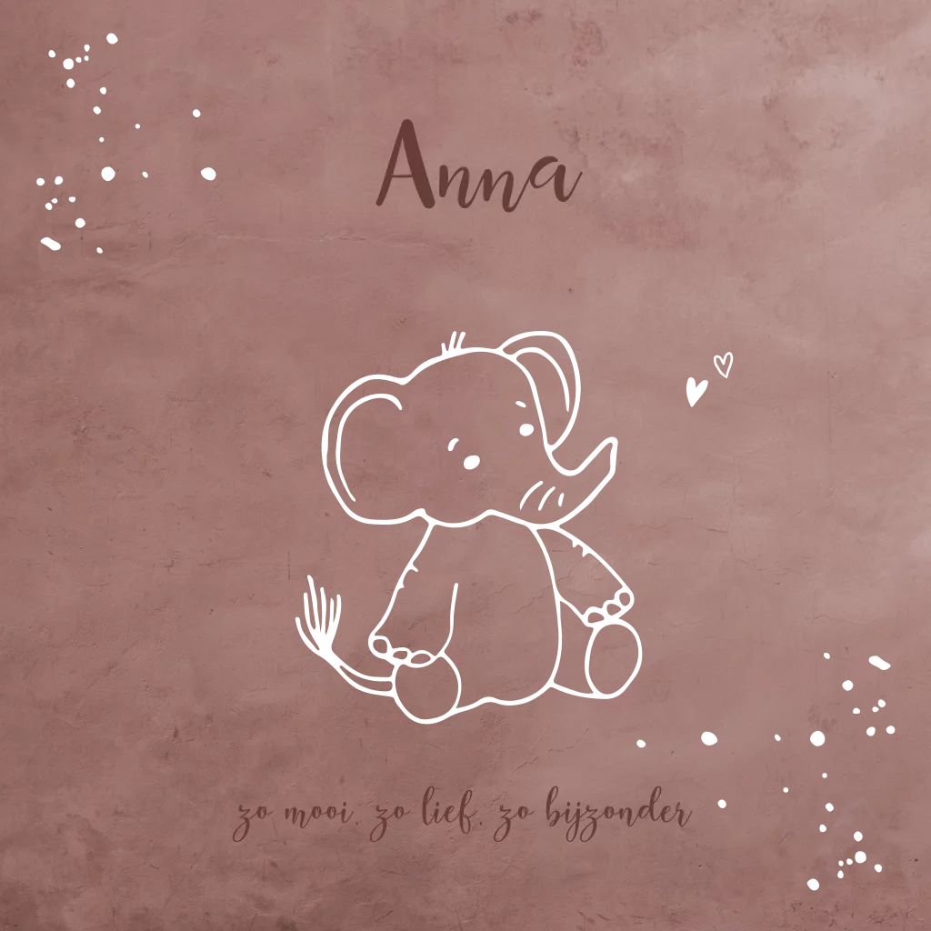 Geboortekaartje meisje warm roze achtergrond en olifant