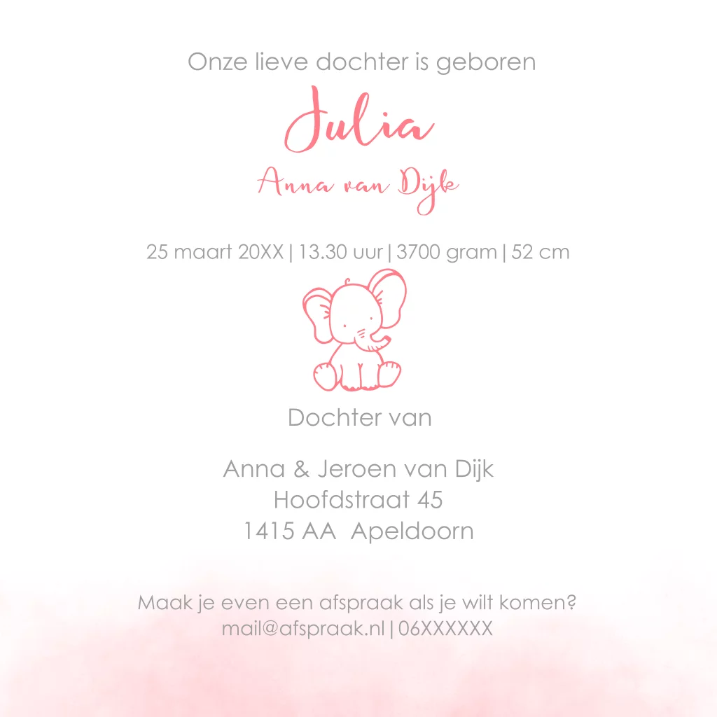 Geboortekaartje meisje met lief klein olifantje in folie. (3747)