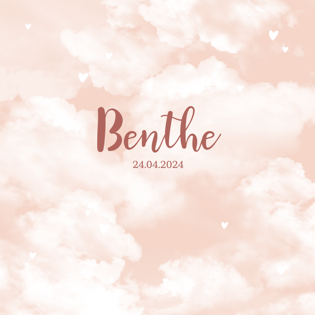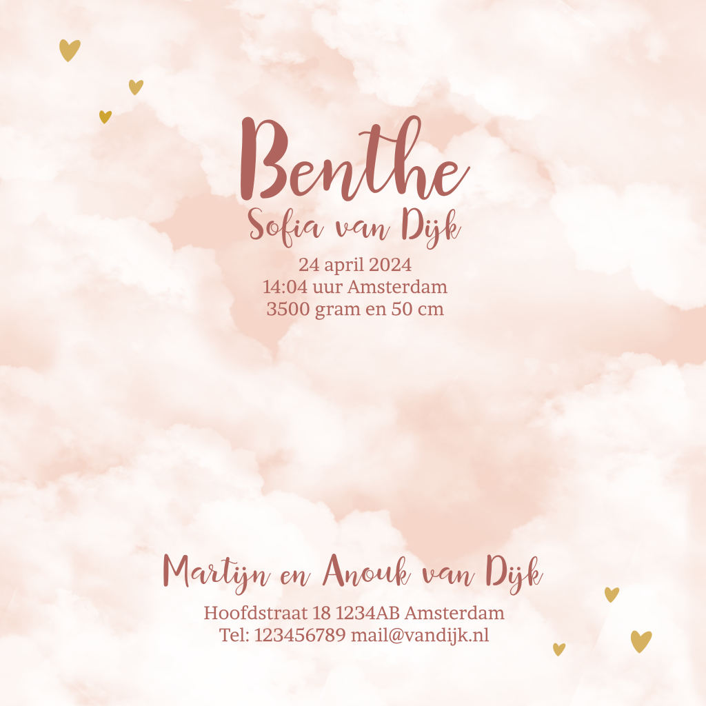 Een lief geboortekaartje met wolken en goudfolie hartjes. De achtergrondkleur en de teksten zijn aanpasbaar. (4015)