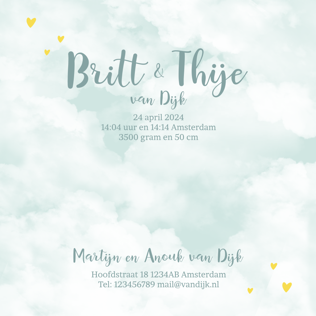 Een lief geboortekaartje voor een tweeling, met wolken en goudfolie hartjes. De achtergrondkleur en de teksten zijn aanpasbaar. (4016)