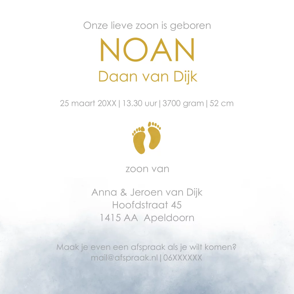 Geboortekaartje voor een jongetje met echt gedrukte foliedruk voetjes. (3489)