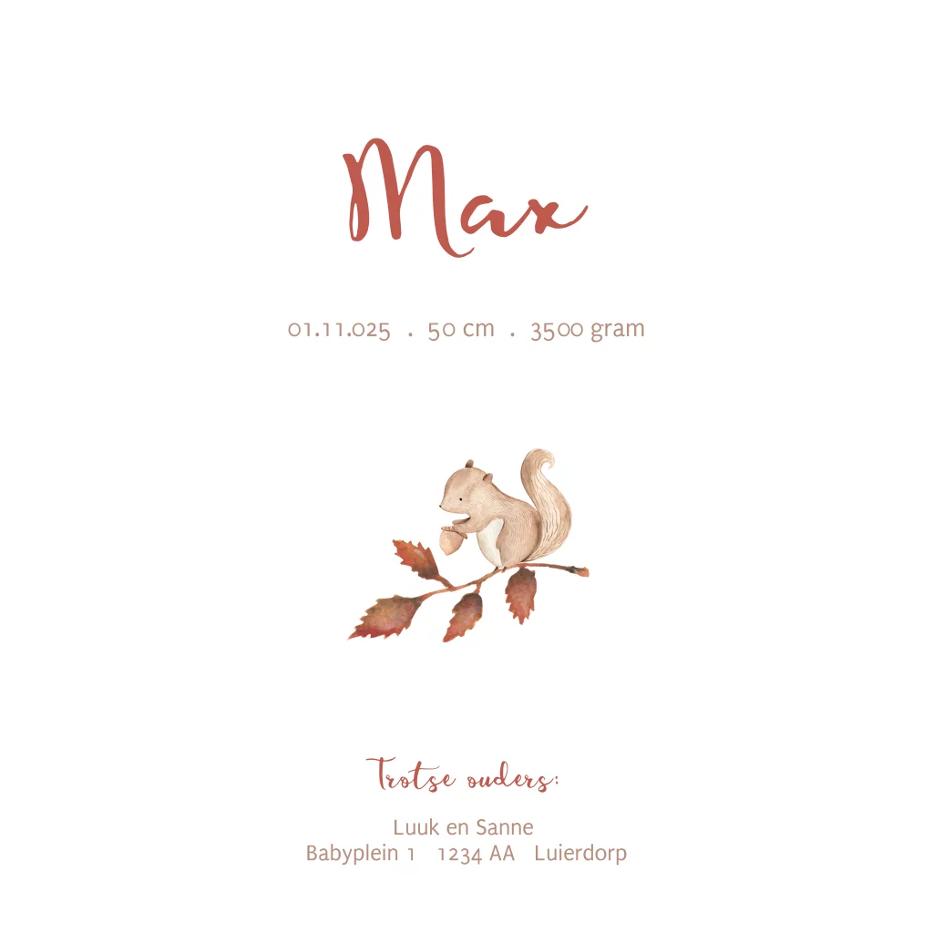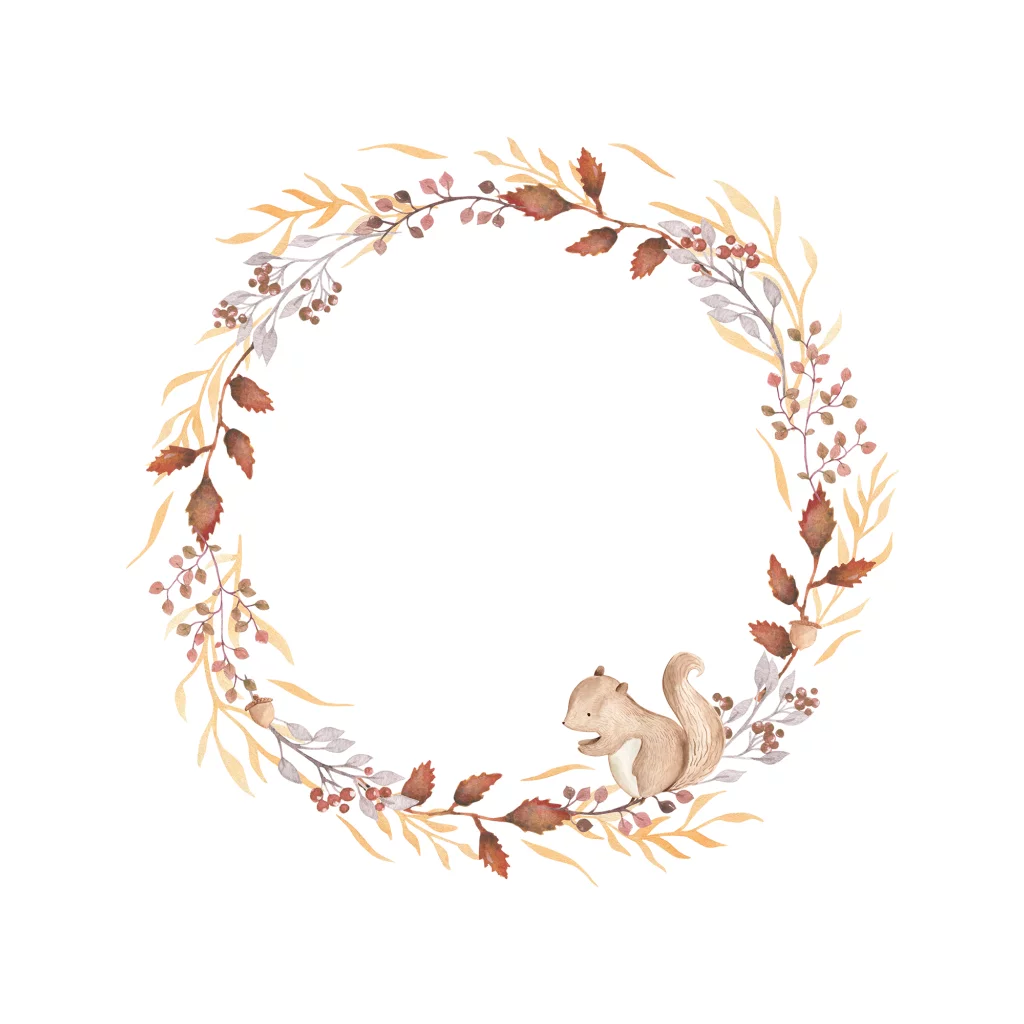 Herfst geboortekaartje met eekhoorn en krans en goudfolie