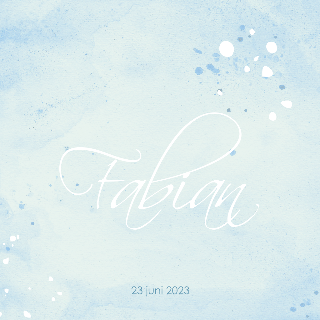 Hip geboortekaartje voor een jongen op aquarel look achtergrond met verfstippen en foliedruk stippen. (3451) De kleur van de foliedruk is in de kaartenmaker aan te passen.