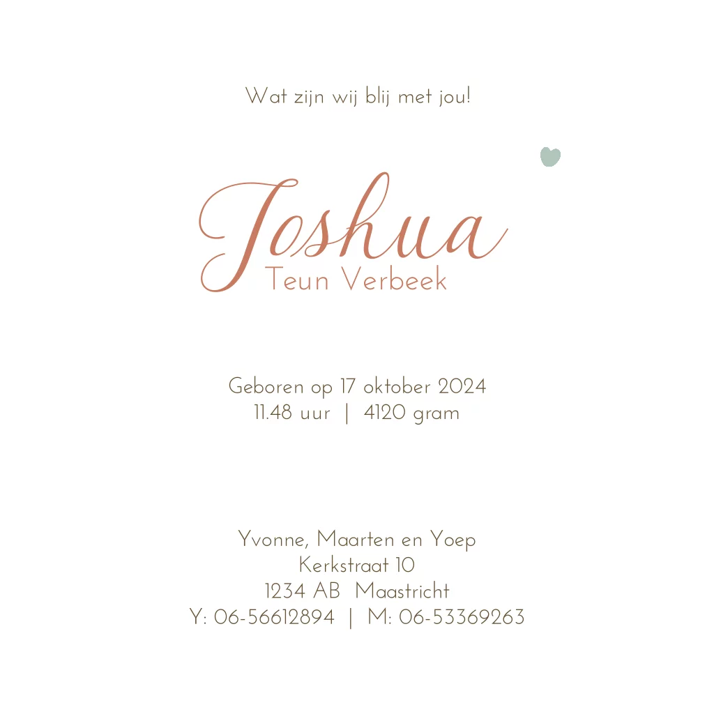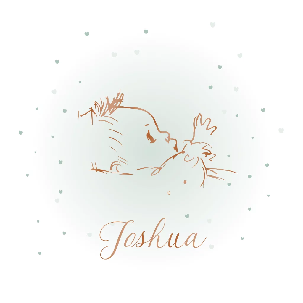 Geboortekaartje met in koper hoogglans lak een lijntekening van een baby en mint groene hartjes. (3897)