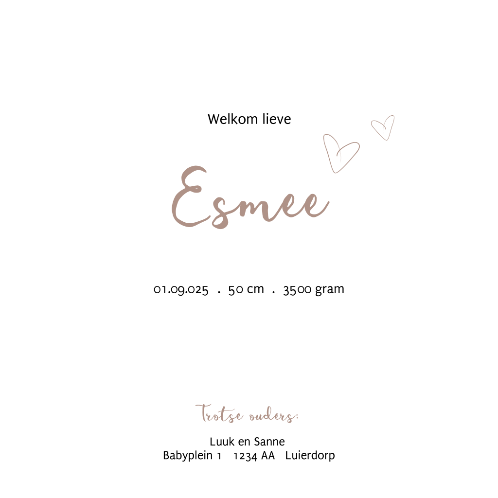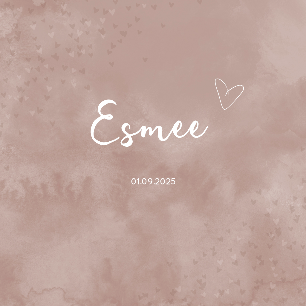 Trendy geboortekaartje voor een meisje met een warme waterverf achtergrond, hartjes en rosegoudfolie. (3737)