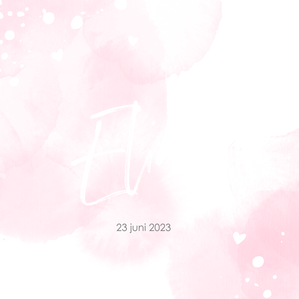 Goudfolie geboortekaartje voor een meisje met op een waterverf achtergrond met enkele spatten en hartjes in goudfolie. (3450) De kleur van de foliedruk is in de kaartenmaker aan te passen.