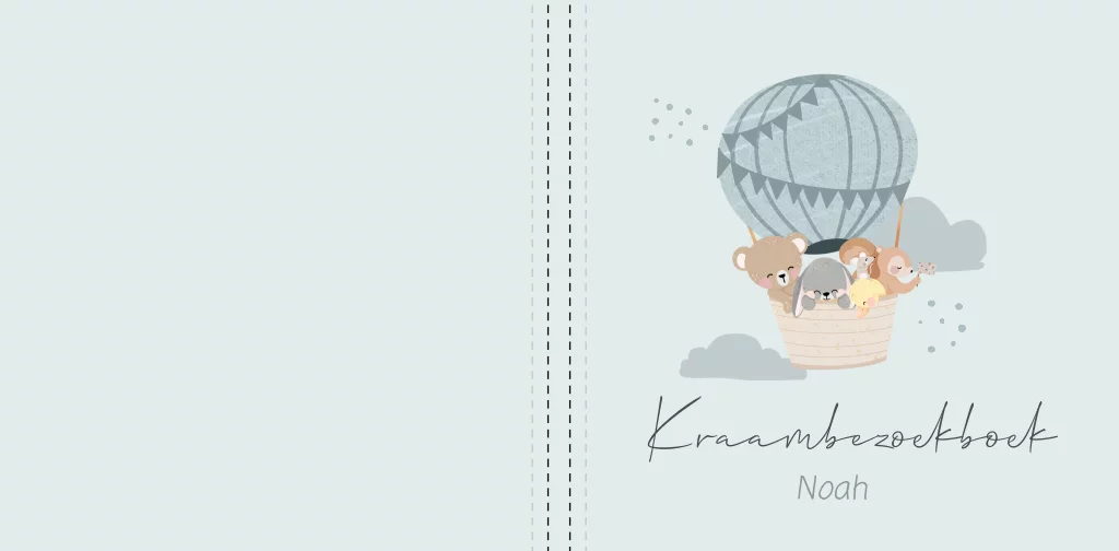 Trendy vergrijsd blauw kraambezoekboek met luchtballon. Het boek heeft een blauwe achtergrond met geïllustreerde bosdieren en een luchtballon. De voor- en achterkant van het boek kunnen aangepast worden in onze online editor.