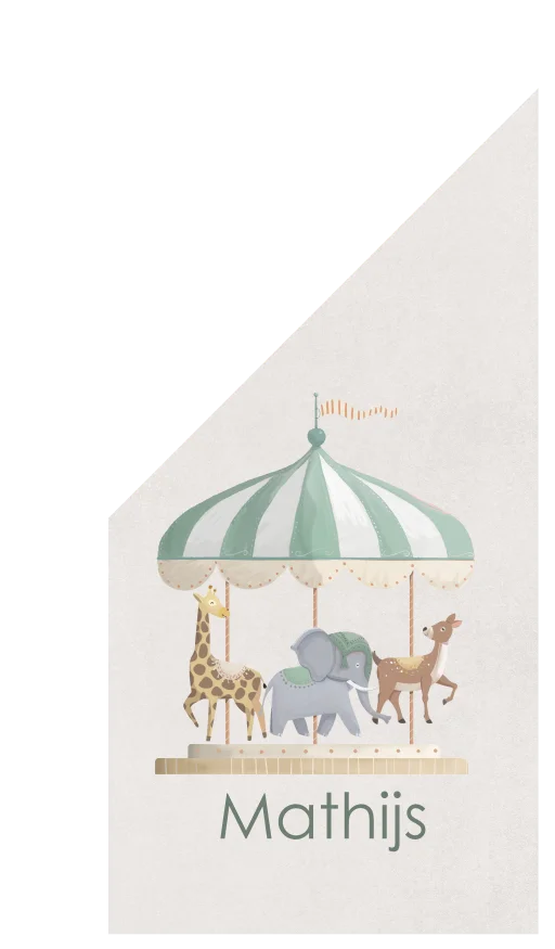 Lief geboortevlaggetje met carrousel en dieren. Personaliseer naar wens in onze online editor.