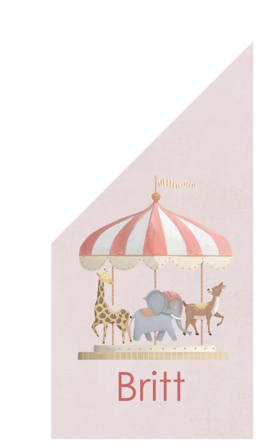een roze geboortevlag met een draaimolen met vrolijke dieren voor een meisje. Bewerk naar wens in onze editor.
