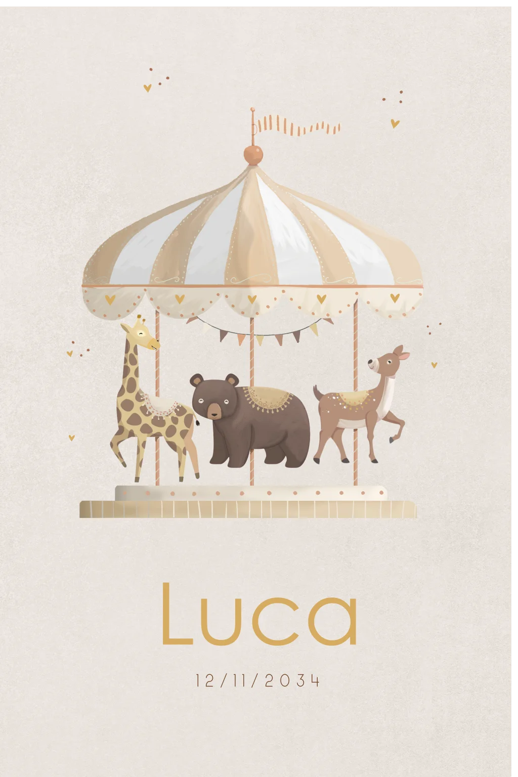 Een beige raambord met een draaimolen met vrolijke dieren voor zowel een jongen als meisje. Bewerk naar wens in onze editor.