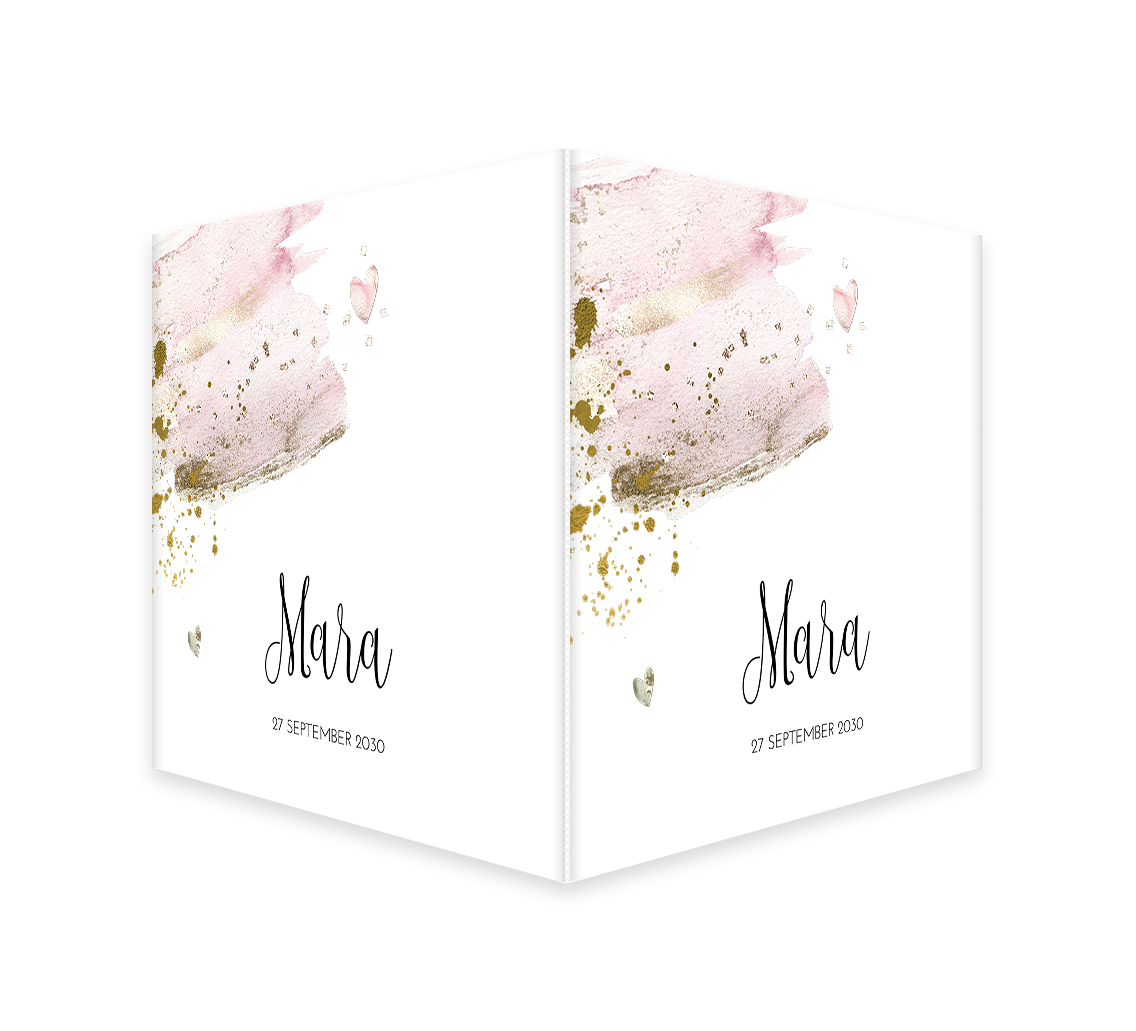 Geboortebord met roze waterverf en goud glitter look.