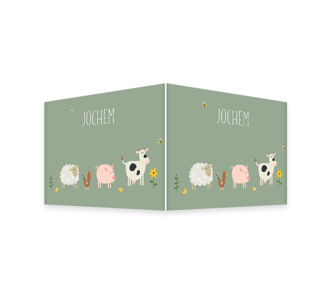 Geboorte aankondiging raambord groen met boerderij diertjes.