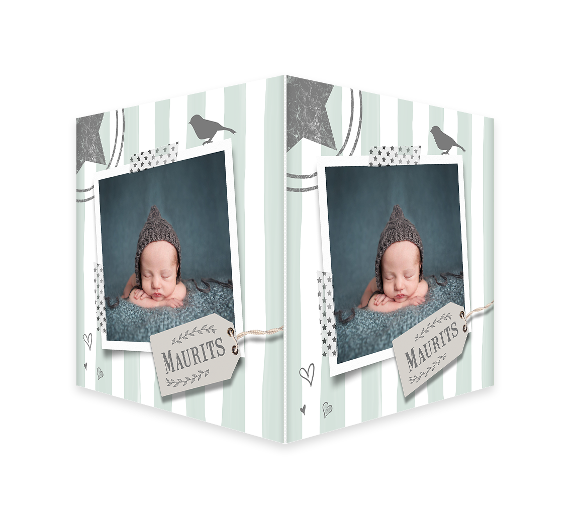 Geboorteborden met eigen foto, mint groene strepen en ster.