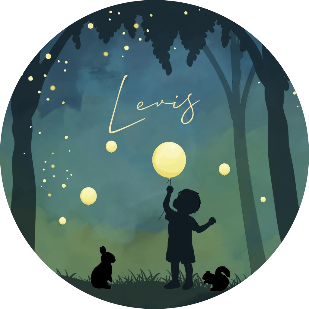 Raamsticker voor een jongen met silhouet van een kindje in het bos die een een ballon vasthoudt. Met een konijntje en eekhoorn. Een magisch ontwerp uit de collectie 'winterliefde'.