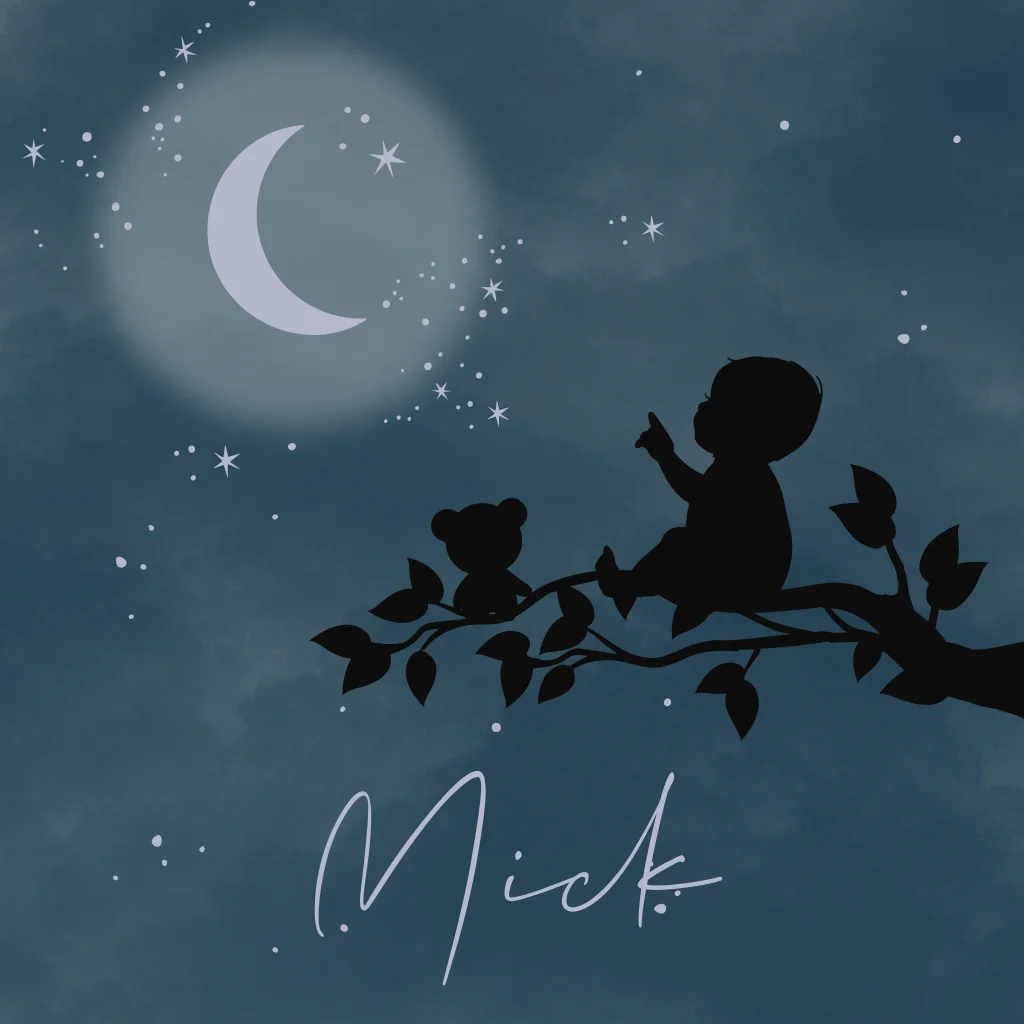 Raamsticker voor een jongetje. Met een silhouet van een jongen met een beertje op tak met maan en sterretjes. Een magisch ontwerp uit de collectie 'winterliefde'.