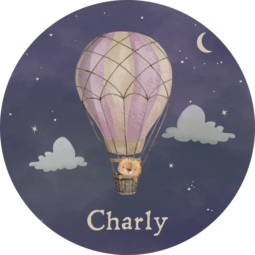 Raamsticker voor een jongen of meisje met een luchtballon met een lieve tijger tussen de wolken, maan en sterrenhemel. Een magisch ontwerp uit de collectie 'winterliefde'.