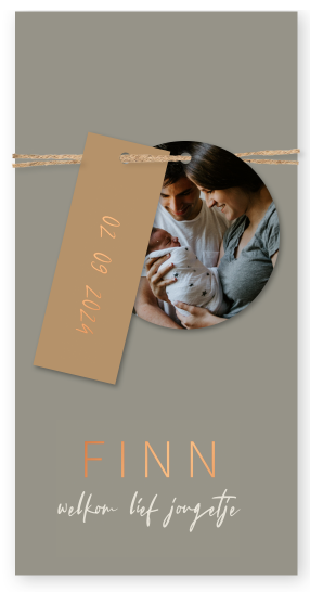 Geboortekaartje jongetje met ronde foto en echt label. Dit is een stijlvol geboortekaartje voor jullie zoontje. Het kaartje heeft een warm grijze achtergrond met foliedruk. Bij het kaartje horen twee labels. Op het ene label kan een lief tekstje worden geplaatst en op het andere label een foto. Maak de 2 losse labeltjes vast met een hip koordje.