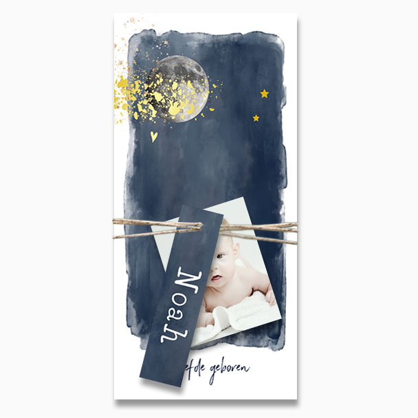 Stoer label geboortekaartje jongen goudfolie, maan en spetters. Maak de 2 losse labeltjes vast met een hip jute touw.