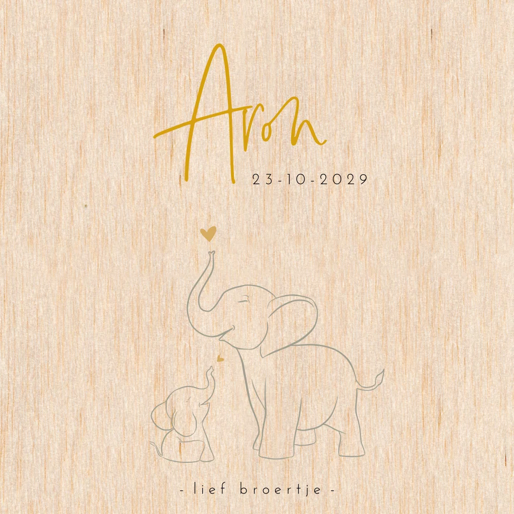 Geboortekaart op hout met lieve olifanten. Voor een jongetje.