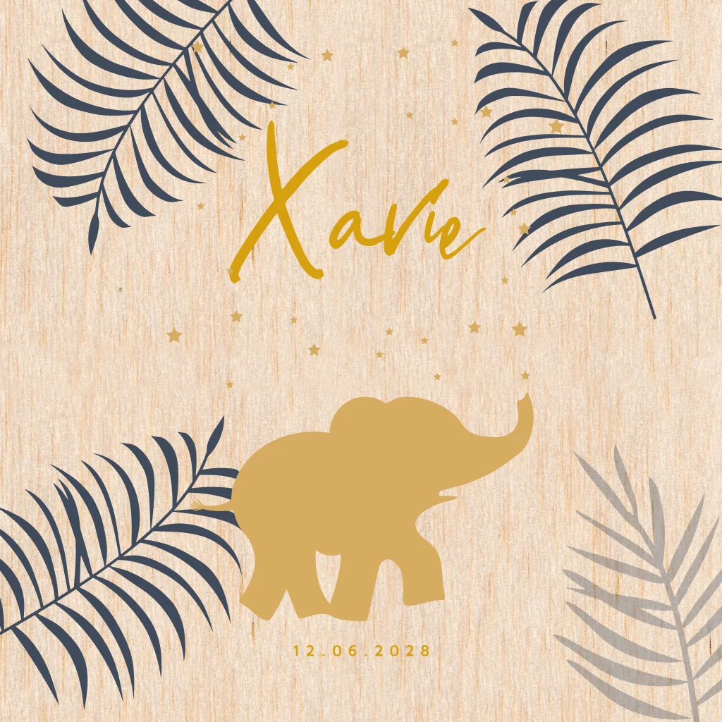 Geboortekaartje hout voor een jongetje met olifantje en jungle blad.
