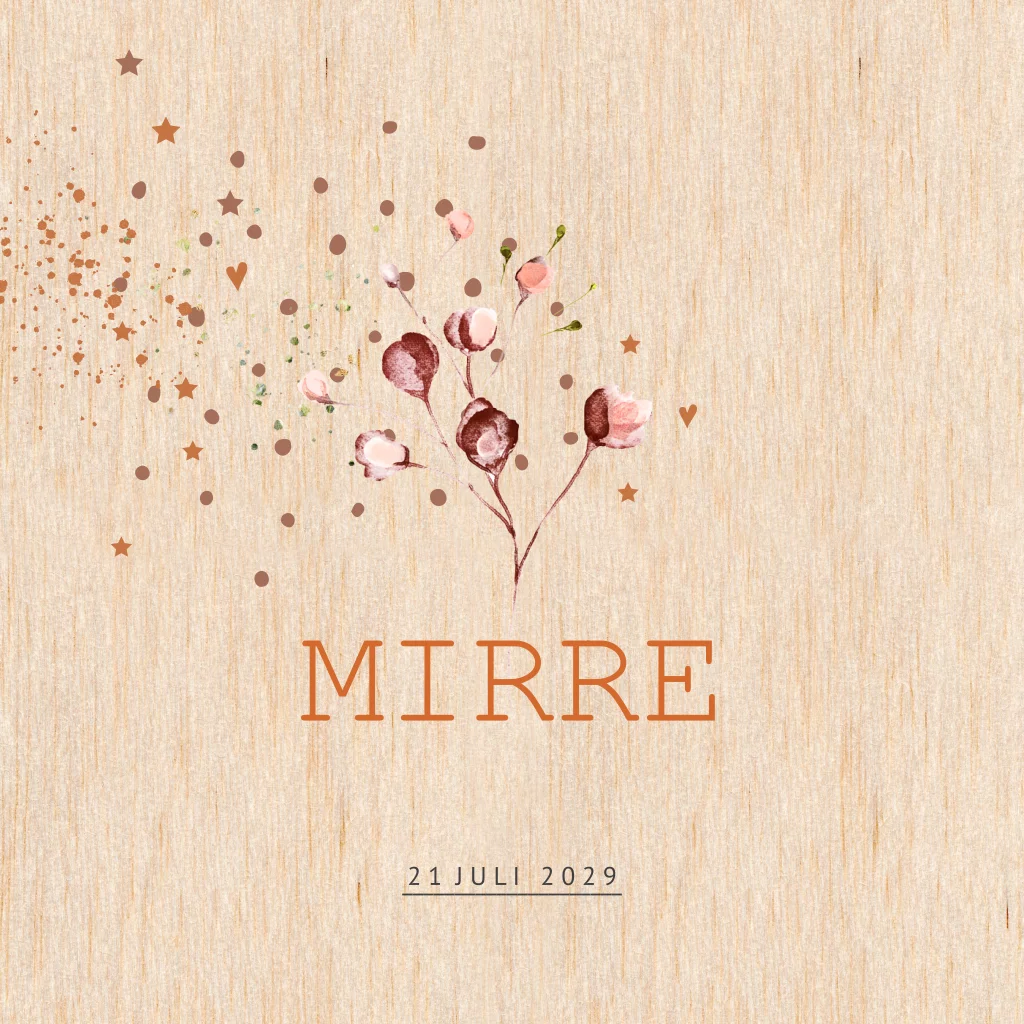 Hip geboortekaartje op hout voor een meisje met bloemen en hartjes.