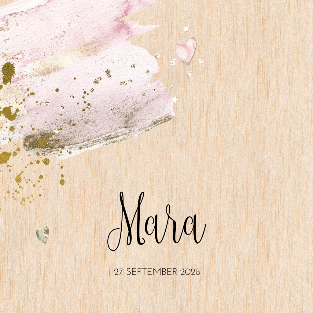 Houten geboortekaartjes hip voor een meisje met roze aquarel en goud glitter look.