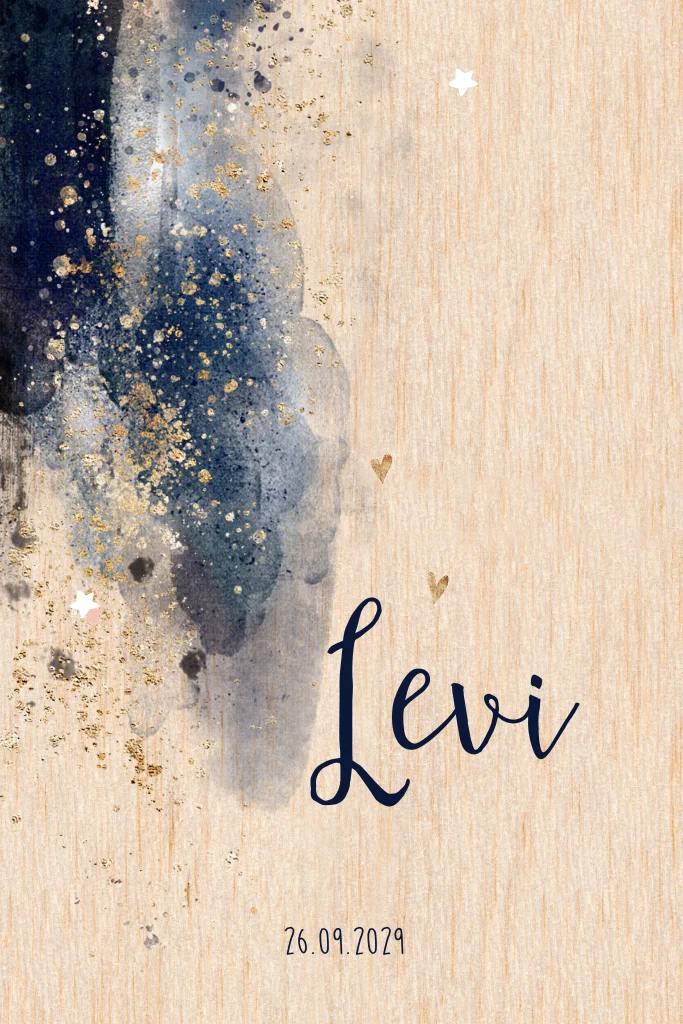 Geboortekaartje van hout met aquarel hippe blauwe kleur voor een jongen.