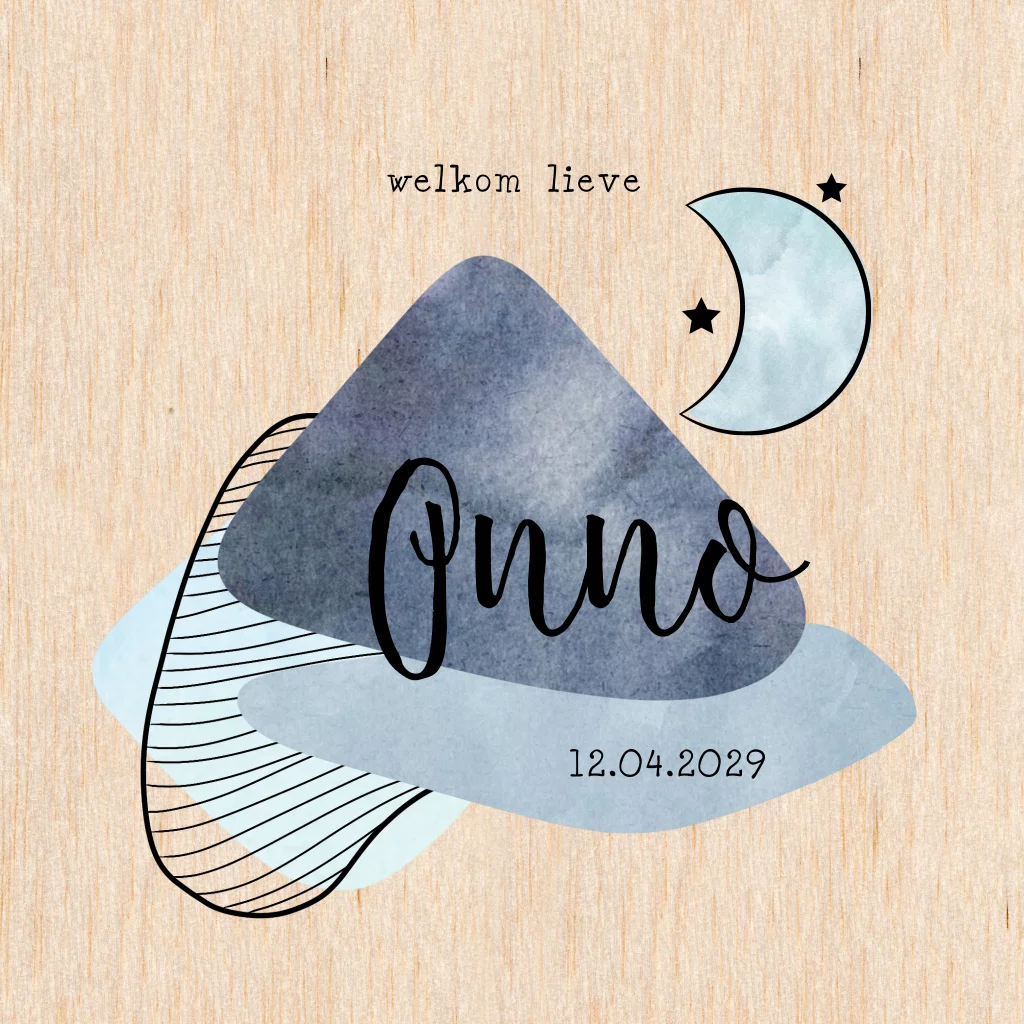Geboortekaartje met hout. Geometrisch en modern voor een jongetje met blauwe maan en ster.