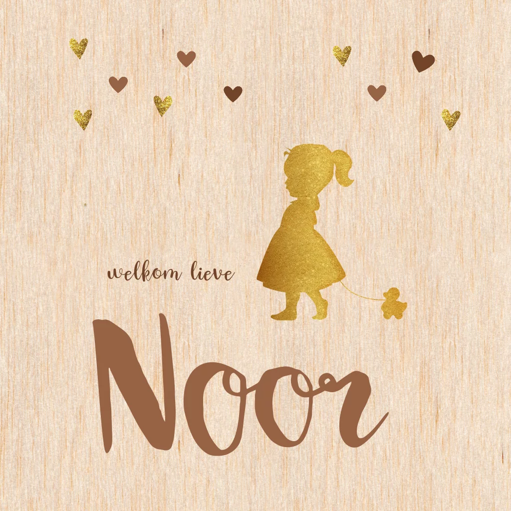 Geboortekaart met hout voor een meisje met een silhouet in goud look.
