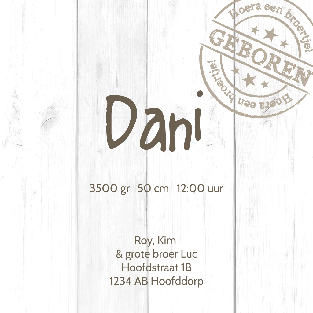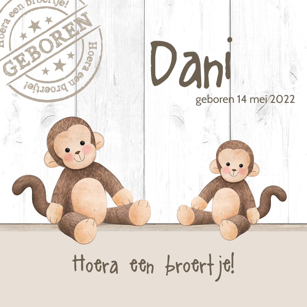 Dit geboortekaartje met 2 aapjes drukt de blijdschap van je oudste kindje duidelijk uit ;-) Het hout en stempel geven dit kaartje een stoer karakter. De lieve aapjes vormen een mooi lief contrast. Je kunt ook 1 aapje verwijderen of toevoegen.