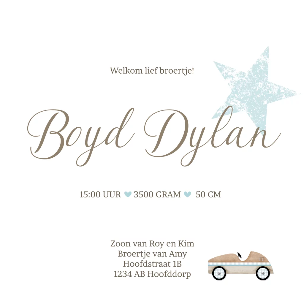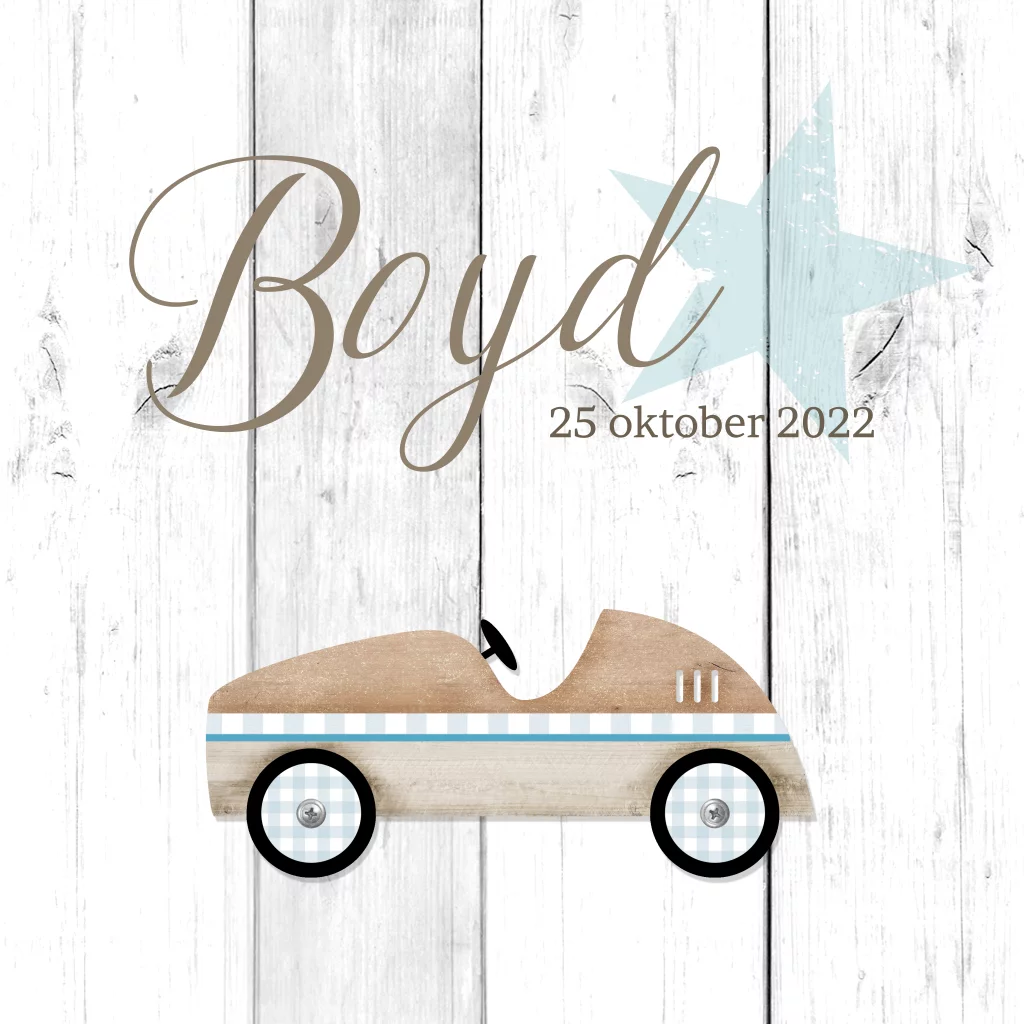 Stoer geboortekaartje voor een jongen met witte houten achtergrond, auto en blauwe ster.