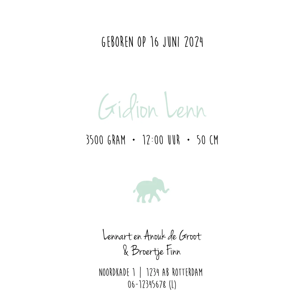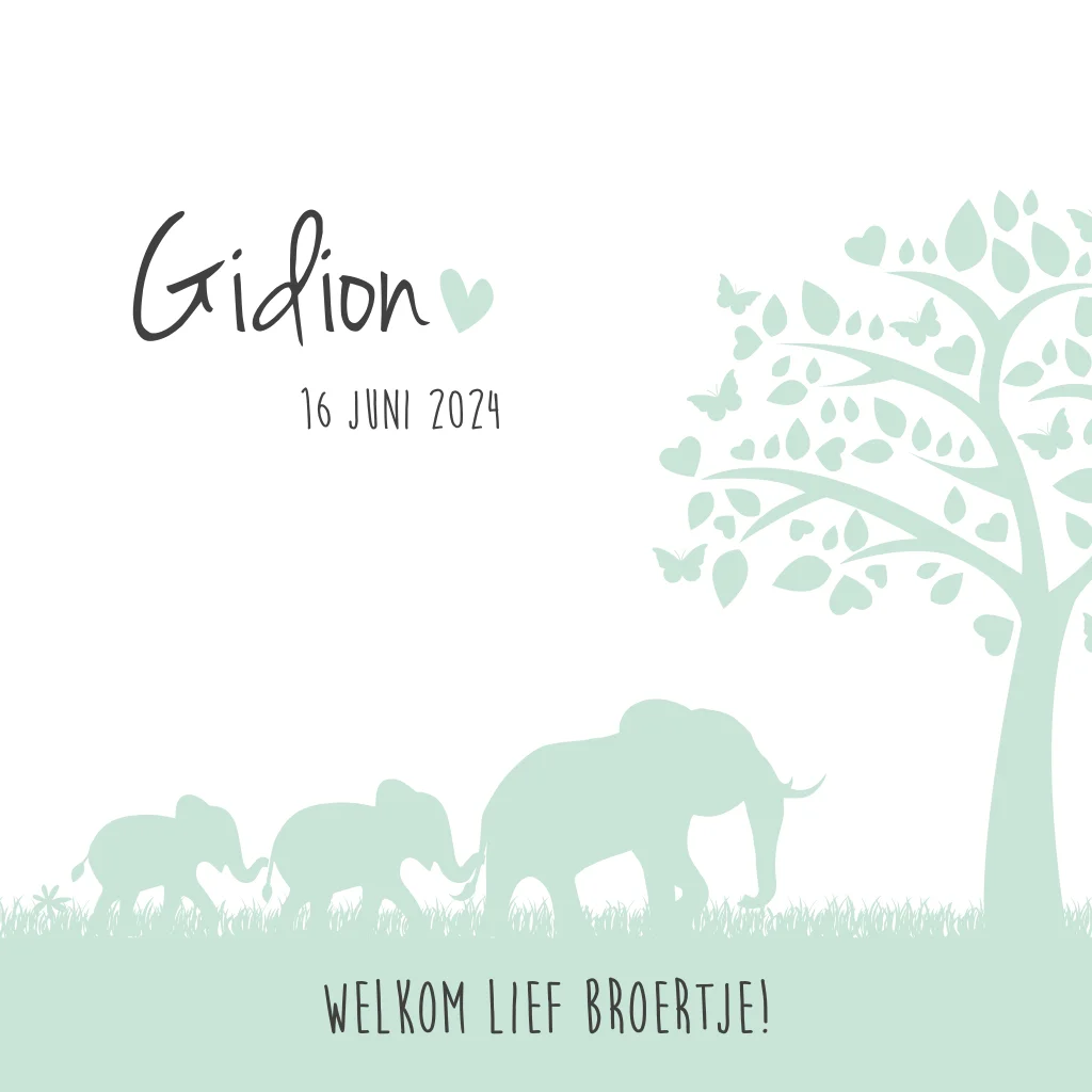 Geboortekaartje met 3 olifantjes wandelend door het gras. De boom bevat naast blaadjes ook hartjes. De elementen in dit kaartje kunnen worden aangepast in grootte en kleur.