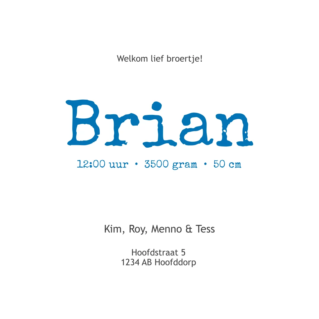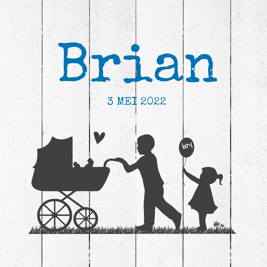 Krijg jij een derde kindje? Dan is dit kaartje wat voor jou. In de kinderwagen ligt de baby te slapen en de grote broer en grote zus lopen erbij. Zie je ook de leuke ballon met 'boy'?