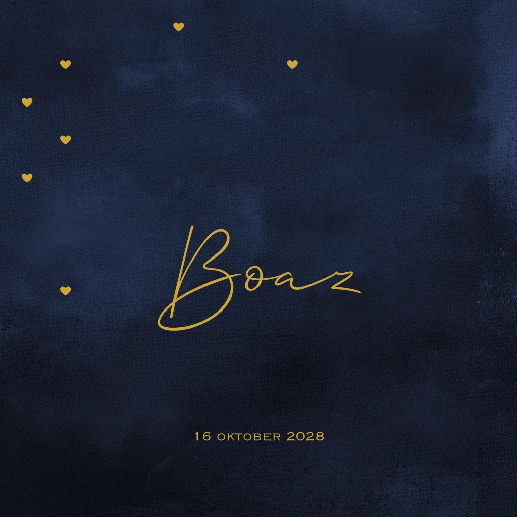 Donkerblauw geboortekaartje jongen met goud look hartjes
