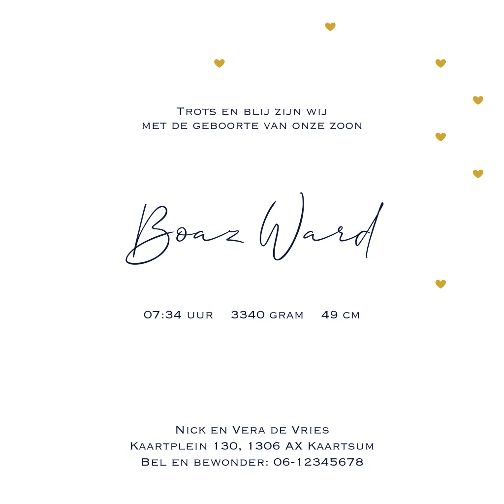 Modern donker blauw geboortekaartje voor een jongetje met goudkleurige hartjes.
