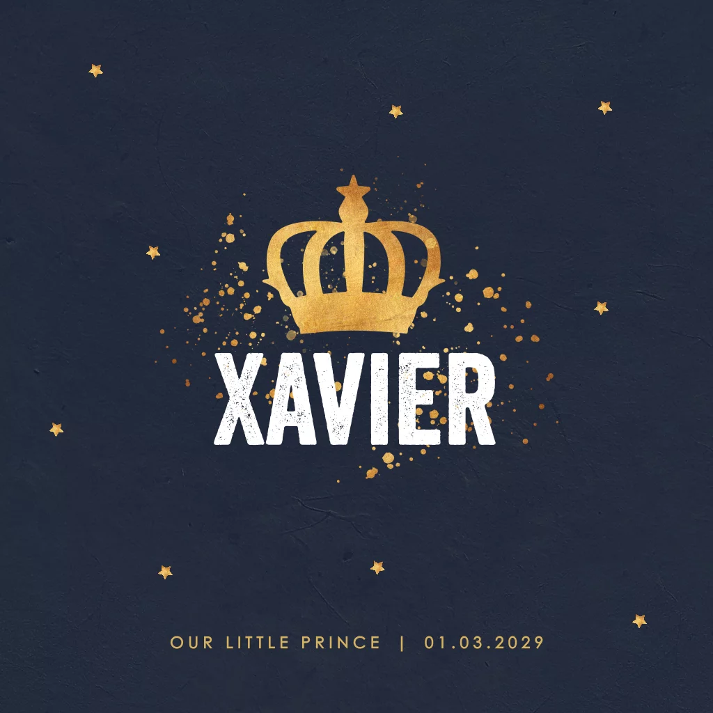 Donkerblauw geboortekaartje jongen met goud look kroon