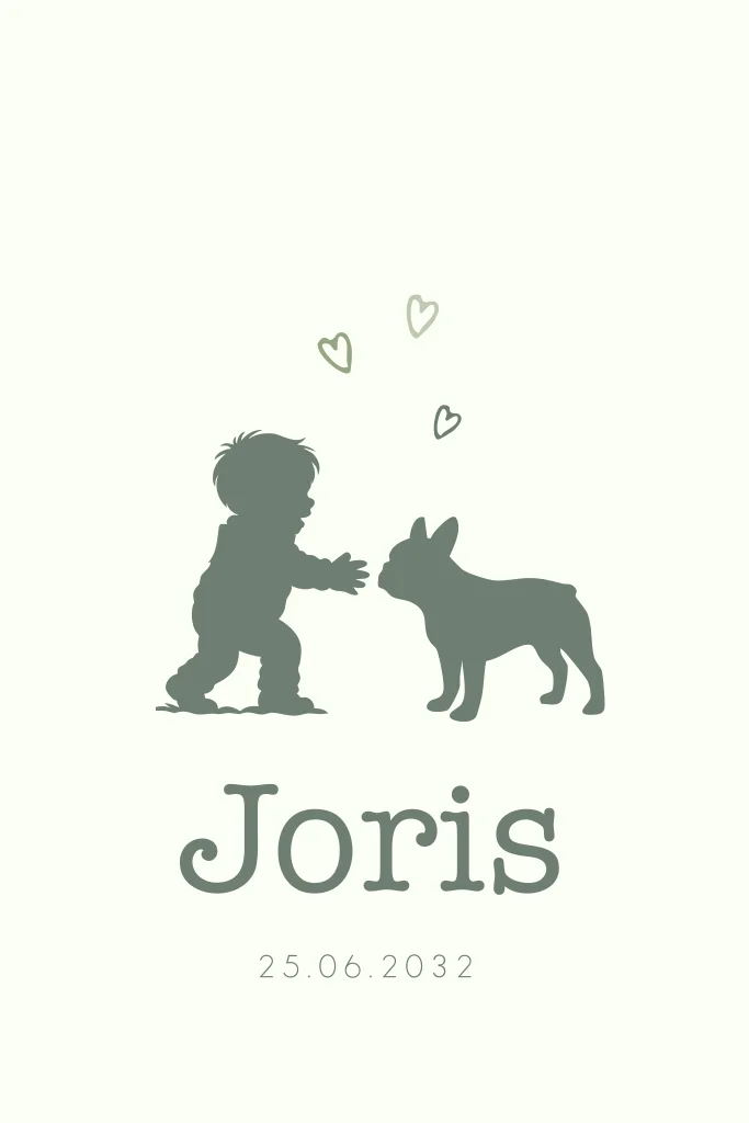 Leuk geboortekaartje met een jongen en een franse bulldog silhouet