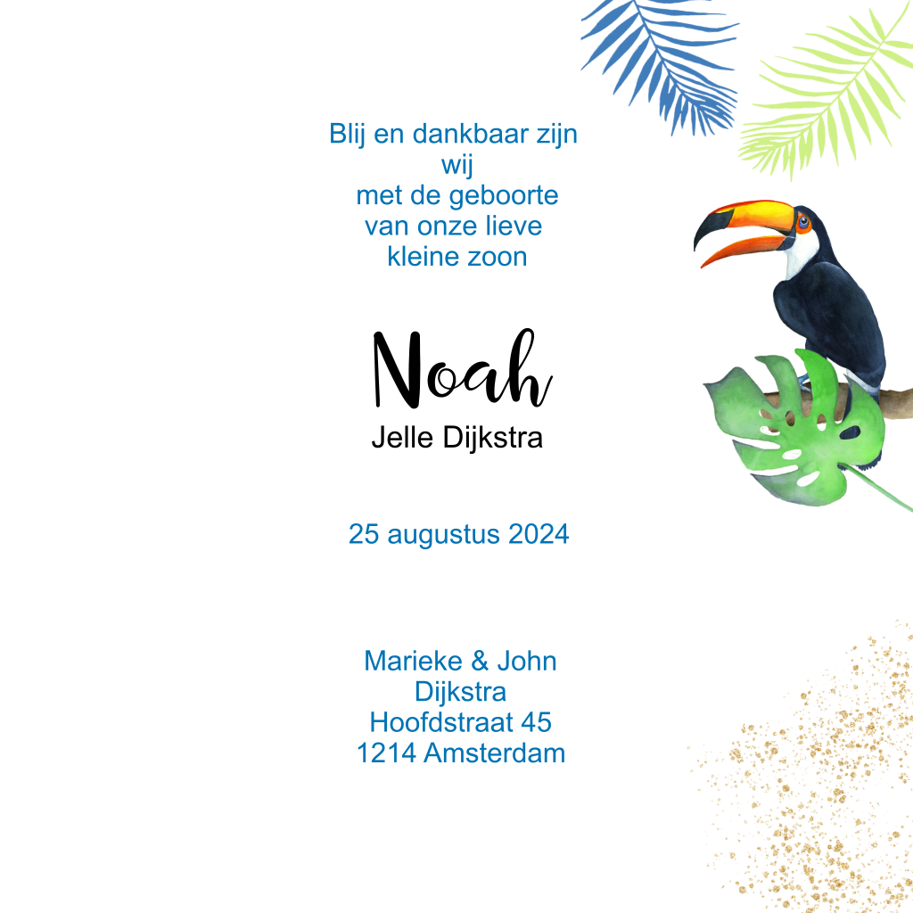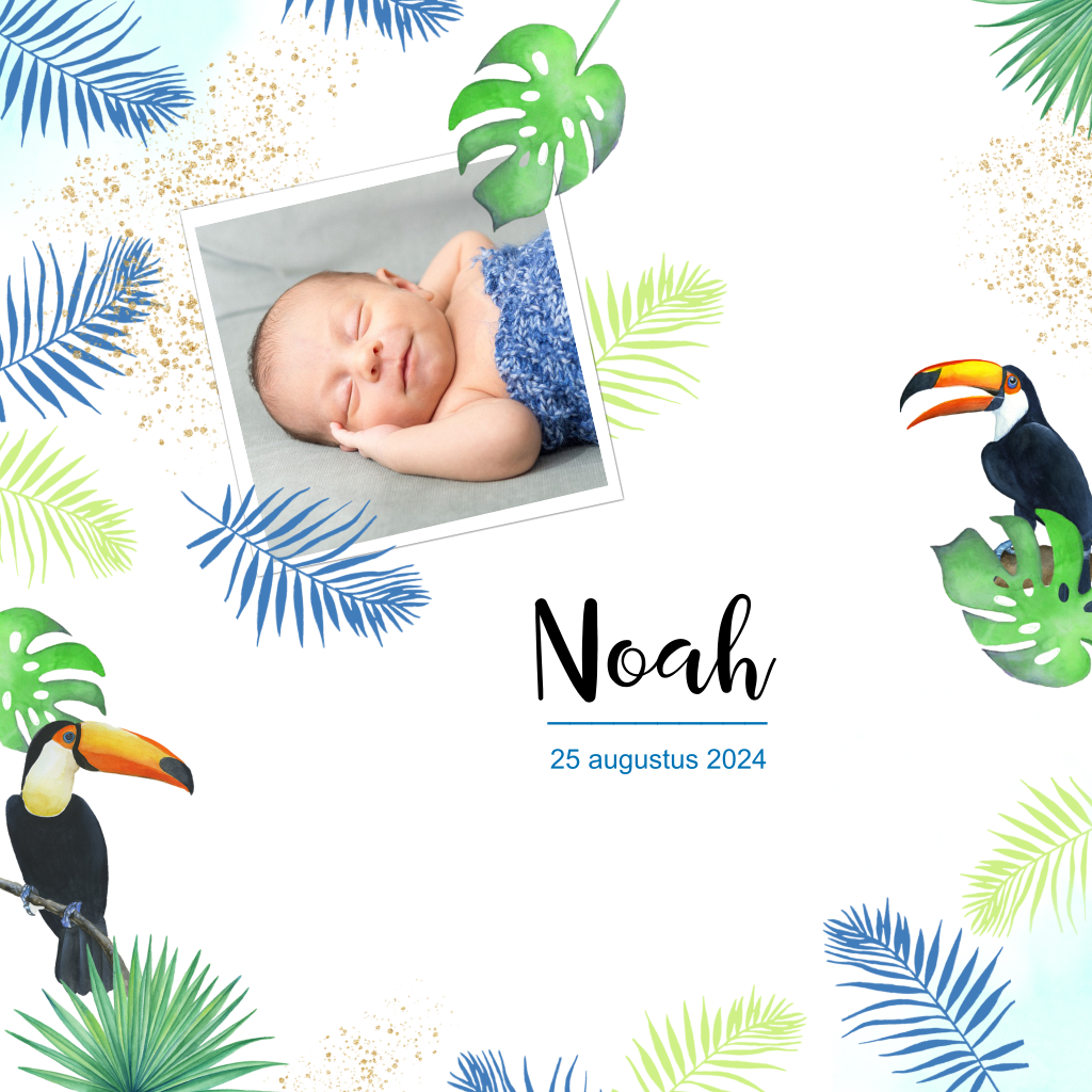 Geboortekaartje voor een jongen met leuke toekan vogels en tropische bladeren. (3034)