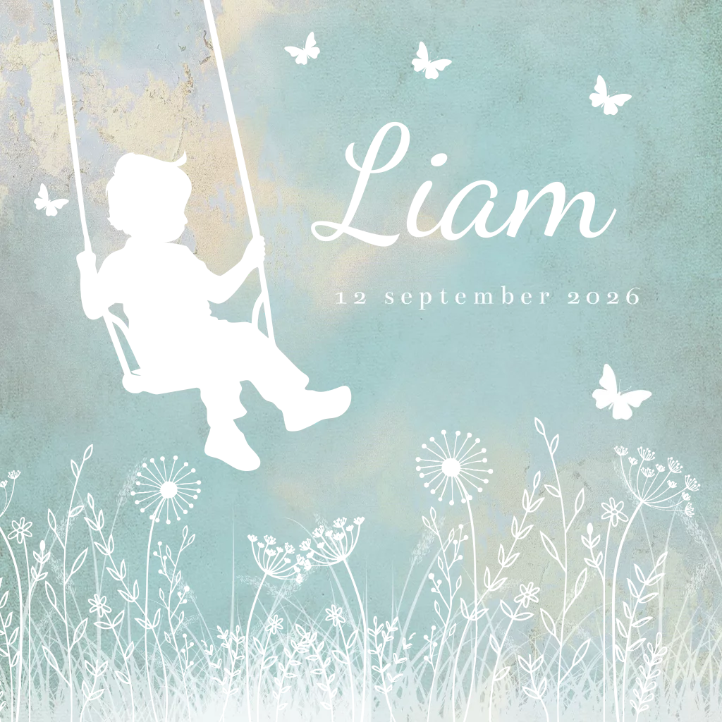 Lief geboortekaartje met silhouet van een jongen in blauw.