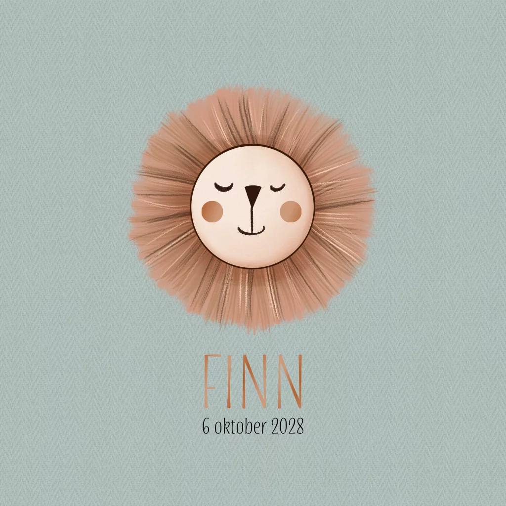 Geboortekaart jongen dierenhoofd leeuw met foliedruk wangetjes. Kleuren, ronde hoeken en folie naar keuze aan te passen. (4471)