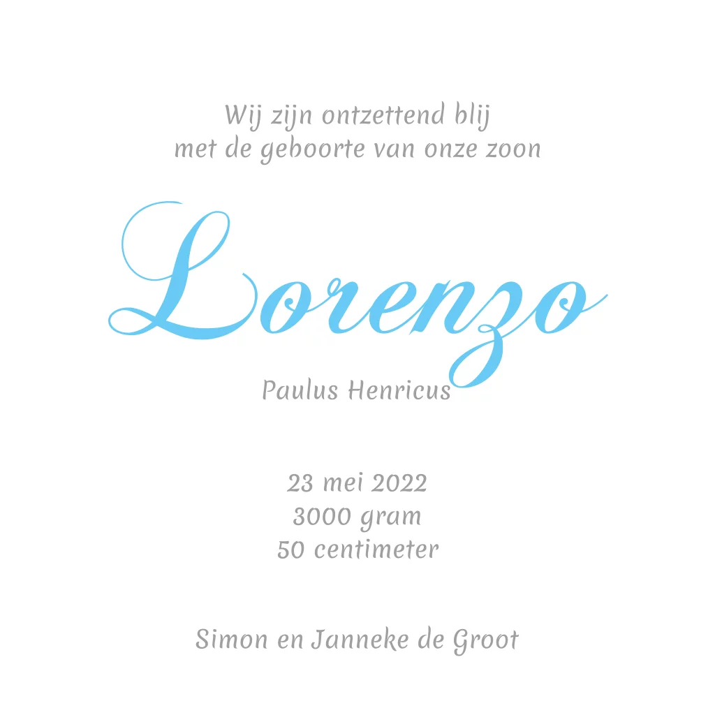Een lief klassiek geboortekaartje met blauwe muisjes. De perfecte kaart om de geboorte van jullie zoon mee aan te kondigen.