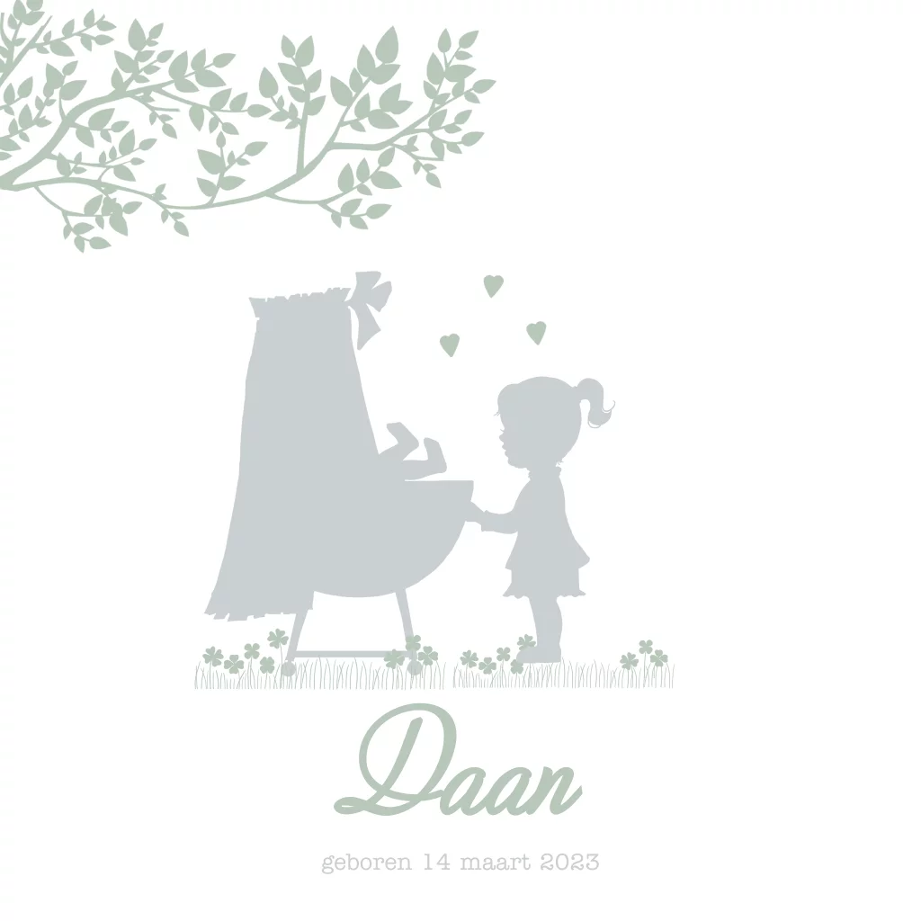 Geboortekaartje 2e kindje jongen met zusje en wieg. (3362) Heeft je kindje een ander kapsel, wil je een broertje of zusje erbij plaatsen? Dat kan allemaal. Neem gerust contact met ons op.