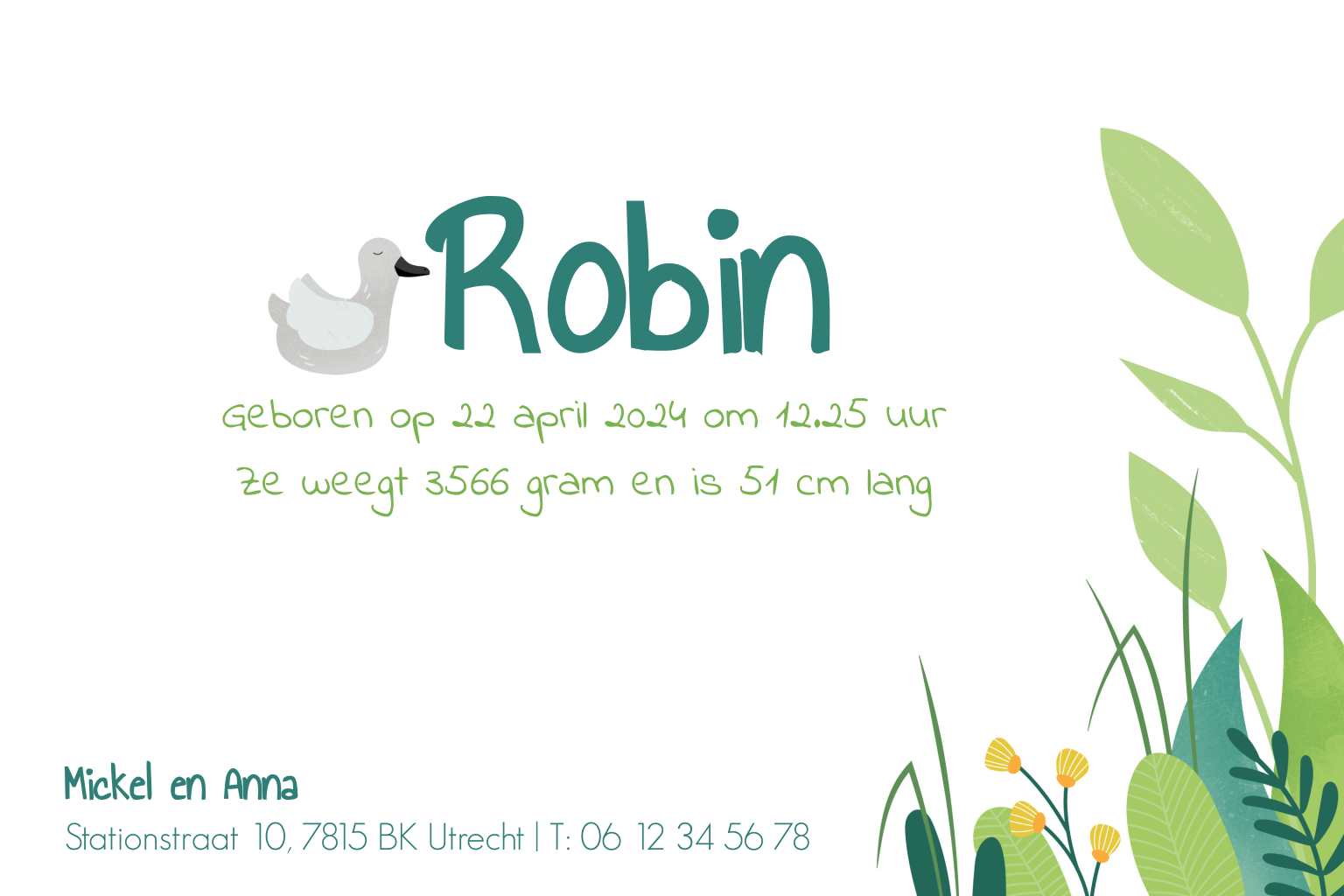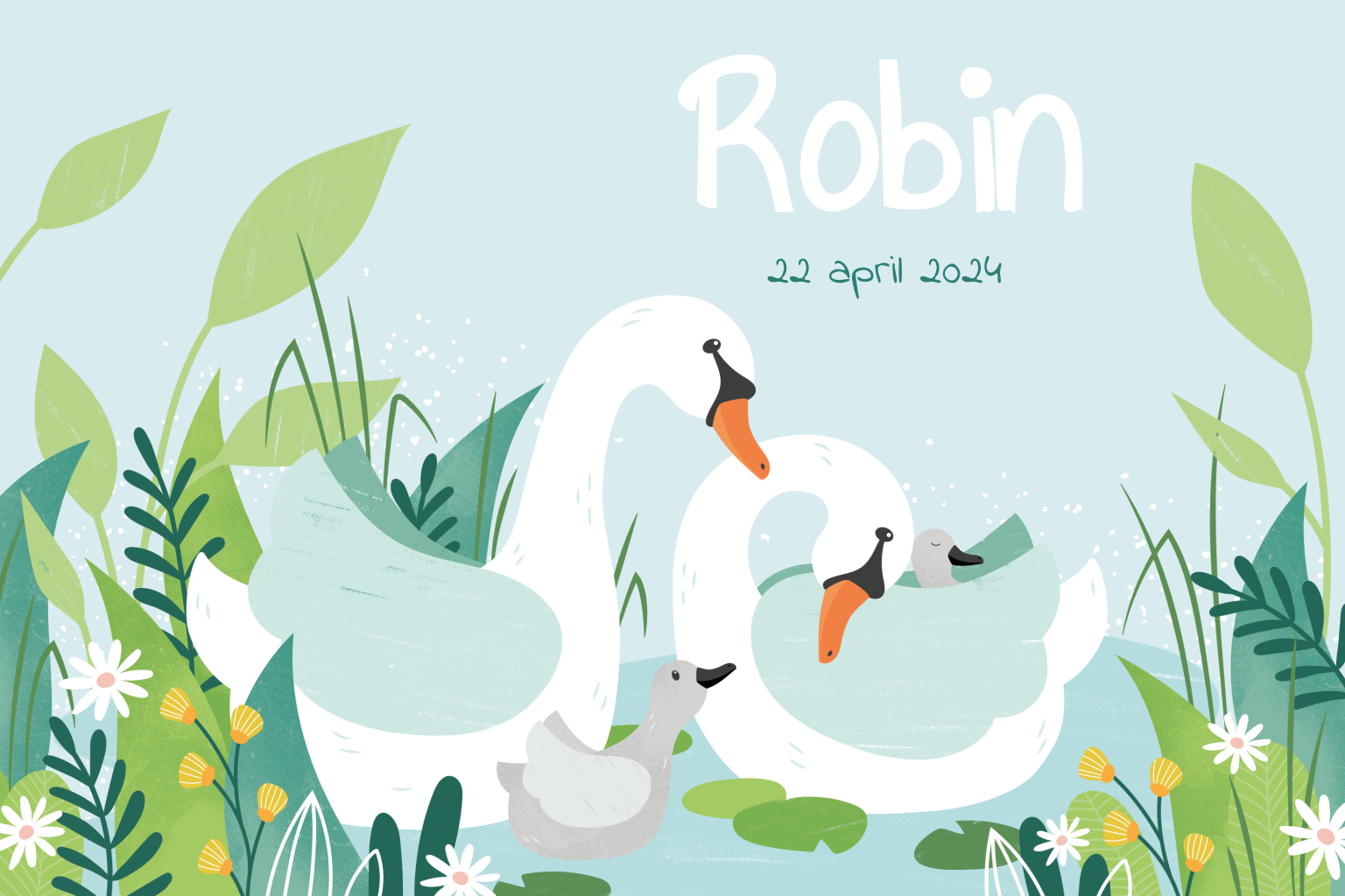 Lief en speels geboortekaartje met zwanen. Papa en mama zwaan met grote broer/zus en een baby in de vijver. In zachte lente kleuren. (3631)