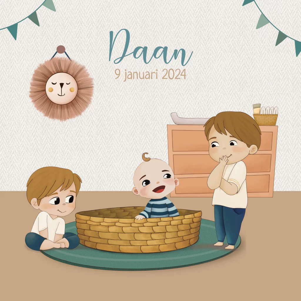 Getekend geboortekaartje jongen in mandje. Babykamer met 2 oudere broers. (4307)